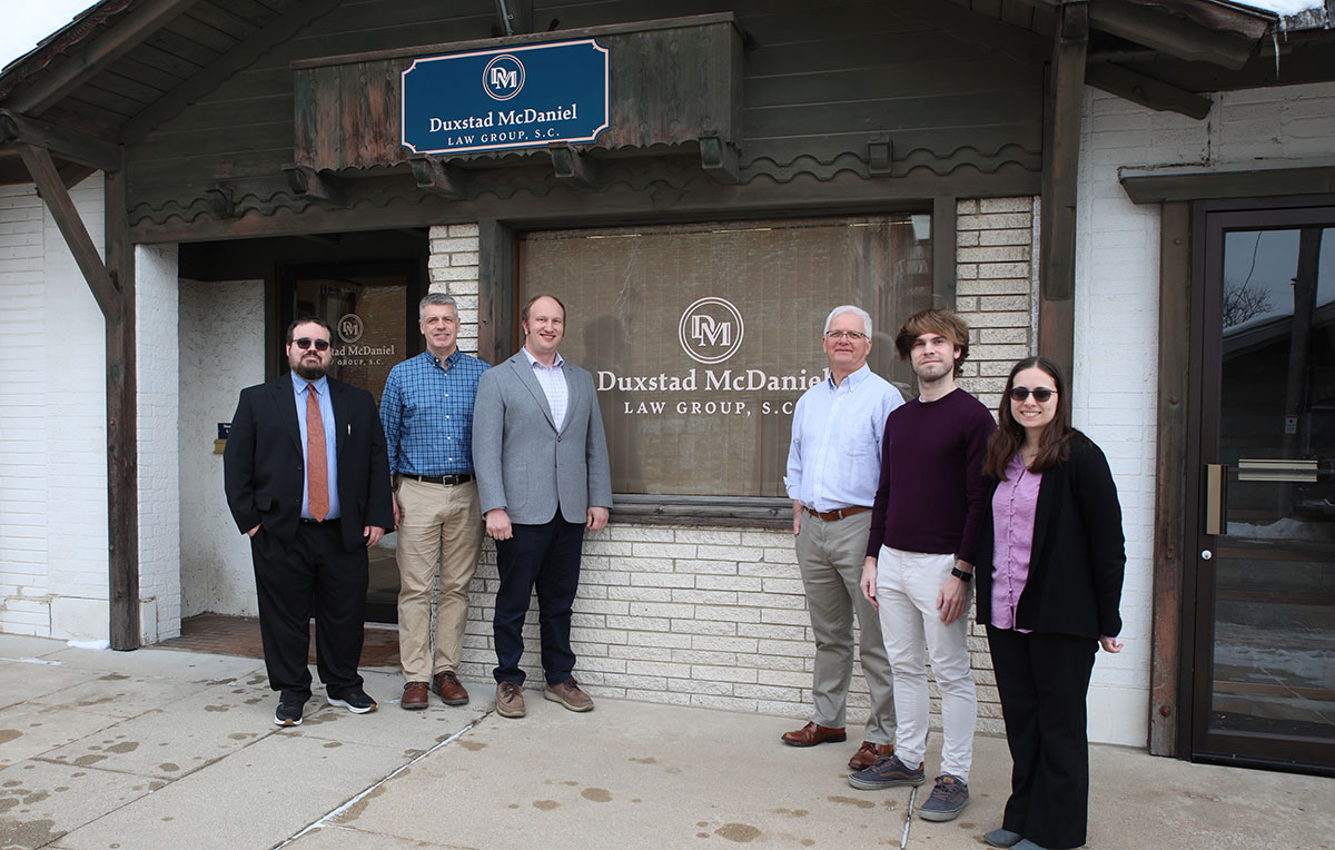 Lawyers with Duxstad McDaniel Law Group SC in Monroe include (from left): Sam Tooley, associate; Lance McNaughton, managing shareholder; David Ewert, associate; Dan Bestul, shareholder; Henry Morris, associate; and Amber Fuerbringer, associate.
