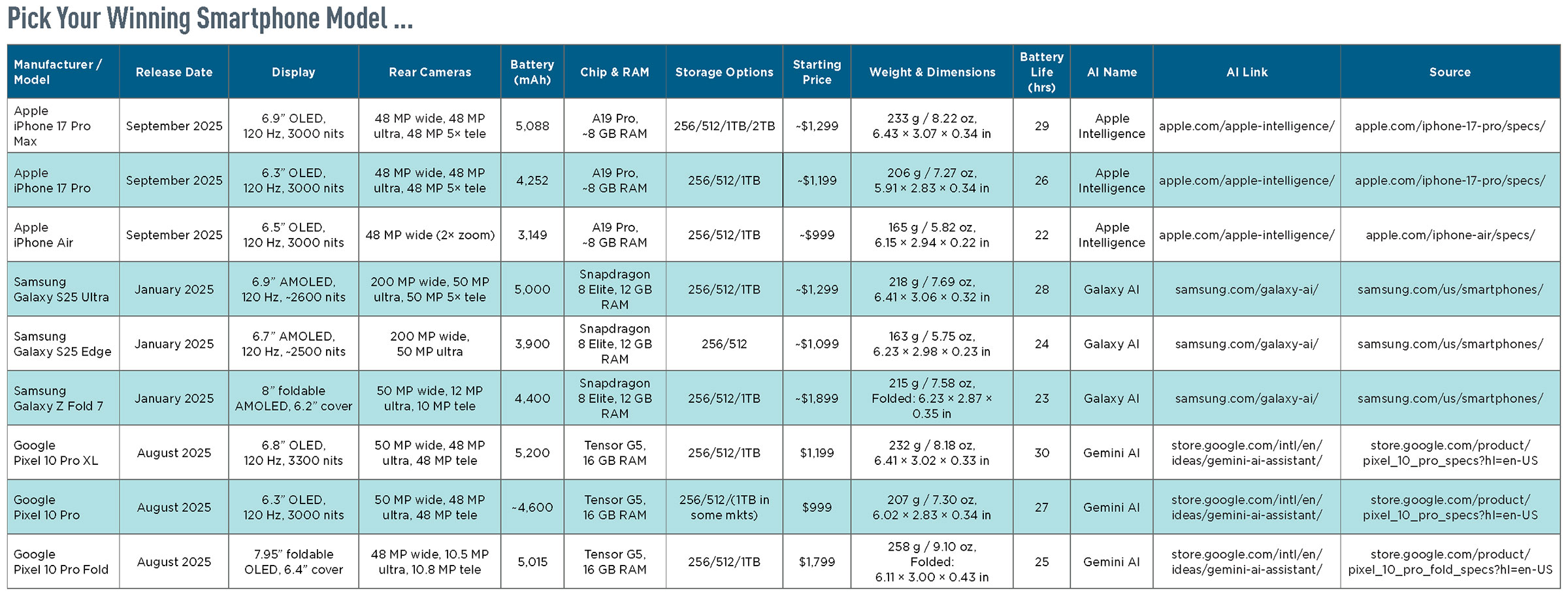 I’ll leave you this year, the final year of this article, with a quick summary of each of the big three manufacturers’ top three phones. All prices are manufacturers’ suggested retail prices. If it’s time for an upgrade, now’s the time to do it if you’re not afraid of accepting AI into your life, as prices and availability remained steady this year despite all the political and economic turbulence. Also, if your current phone is three or more models behind, know that it won’t be long before it’s obsolete.