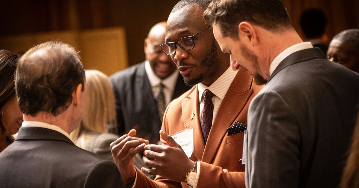 MBA Judges Night. Last month, the Milwaukee Bar Association (MBA) held its annual Judges Night at The Grain Exchange in Milwaukee. In this photo, Emil Ovbiagele, immediate past president of the MBA, engages with Ryan Billings (left), immediate past president of the State Bar, and Jonathan Gruhl (right) of Gruhl Law Firm. Ovbiagele is also a member of the State Bar’s Board of Governors. Photo courtesy of the MBA.